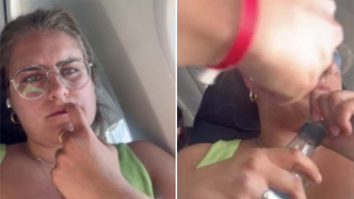 A flight passenger captured on video when her neighbor leaned into her space on a recent flight. The footage has gone viral on TikTok. (Fanny Gagnon O’Donnell/Storyful)